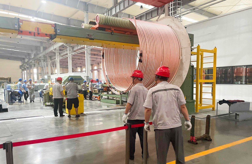 20:55,直管生產班組長于有龍根據客戶要求開始進行Φ54×2直管的工藝試驗,精度方面必須先確保壁厚2mm不能出現負公差,再研究控制正公差;幾次試制下來,于班長最終定好拉制工藝,與直拉機師傅囑咐妥當后,才和李祥鵬部長完成交接下班回家。李祥鵬部長、孫濤部長、楊書虎科長、高元陽科長、質檢巡檢員羅學迅輪流駐在直管生產線進行檢驗,把控精度公差,每10分鐘做一次檢測,確保生產出的銅管在客戶要求的范圍之內。大直管粗重,拉制起來勞動強度大要求條件高,四位直拉機員工師傅在高溫下很快汗流浹背,身上的工作服被汗水浸透,被散熱扇吹干了又濕、濕了又干,反反復復。李部長看在眼里、疼在心里,忍不住下手與員工師傅并肩一起干。