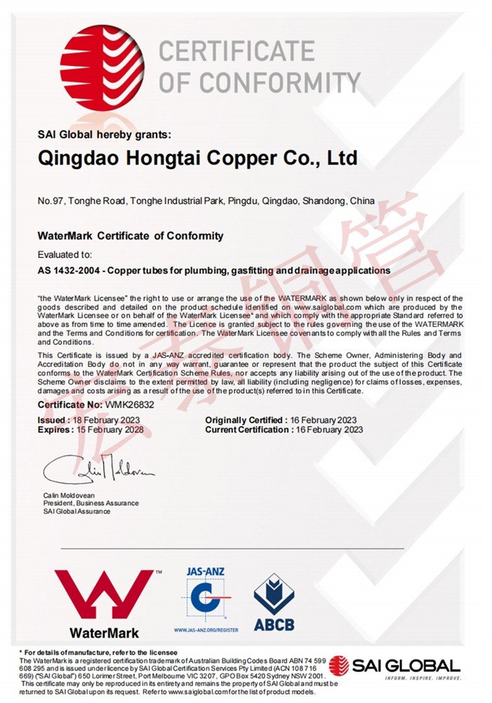 宏泰銅管產(chǎn)品順利通過(guò)AS 1571無(wú)縫制冷用銅管標(biāo)準(zhǔn)認(rèn)證【證書編號(hào):SMK41618】和AS 1432給排水銅管標(biāo)準(zhǔn)認(rèn)證【證書編號(hào):WMK26832】。