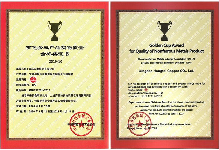 2019年10月至12月,中國(guó)有色金屬工業(yè)協(xié)會(huì)專家委員會(huì)對(duì)青島宏泰銅業(yè)有限公司申報(bào)的空調(diào)與制冷設(shè)備用銅及銅合金無(wú)縫管進(jìn)行實(shí)地審核和答疑。經(jīng)專家委員會(huì)審核認(rèn)定:青島宏泰銅業(yè)有限公司申報(bào)的空調(diào)與制冷設(shè)備用銅及銅合金無(wú)縫管的實(shí)物質(zhì)量達(dá)到了國(guó)際同類產(chǎn)品實(shí)物質(zhì)量,特授予有色金屬產(chǎn)品實(shí)物質(zhì)量金杯獎(jiǎng)。