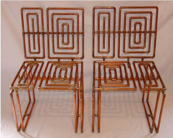 銅管桌子說完了,再說說椅子,看到上圖,各位讀者未免懷疑這板凳的穩(wěn)定性,如果你親自用手彎一下外徑35mm,壁厚且2mm的銅管,相信你再也不會擔(dān)心這板凳的承重能力,銅管可按照自己的想法切割,但是事先得設(shè)計好圖紙,用銅管設(shè)計最重要的是要考慮連接處的穩(wěn)定性,以銀焊條焊接可以很好的保證連接處的穩(wěn)定性,以上的板凳如果讀者對靠背的牢固程度擔(dān)憂,可在椅面與椅背之間加一根支撐,利用三角形的穩(wěn)定性,也可在椅面與椅背之見做一個矩形的扶手,實用也不影響美觀。